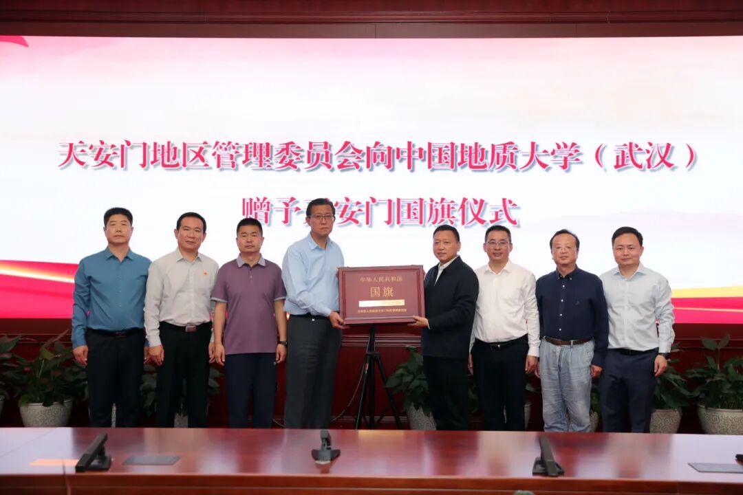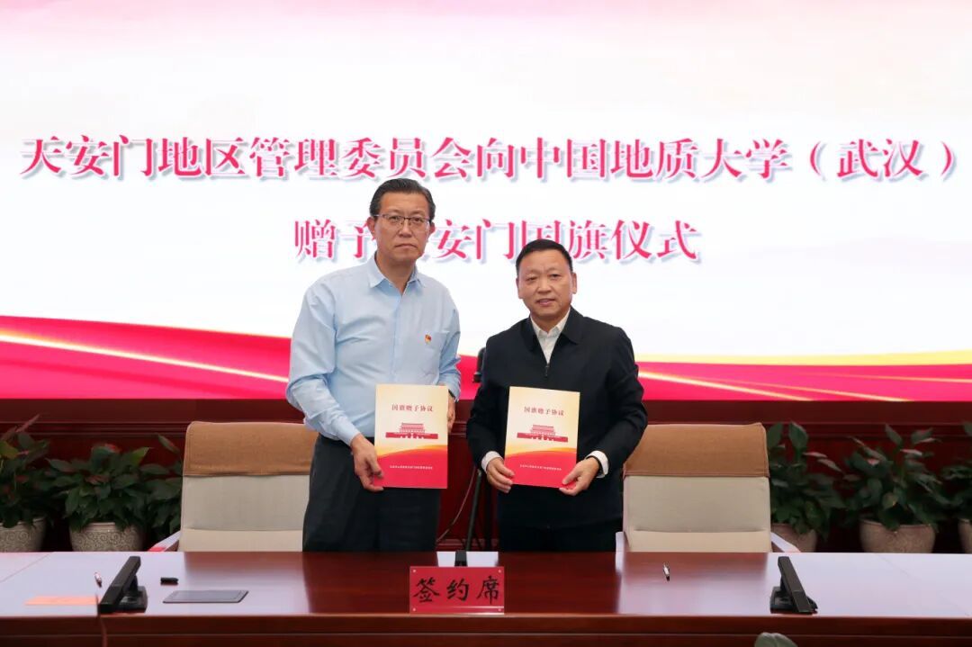 9月25日,北京市人民政府天安门地区管理委员会向中国地质大学(武汉)赠送天安门国旗。赠予仪式在天安门地区运行调度中心举行,天安门地区管委会党组成员、副主任(正局长级)姚辉向学校赠送国旗,党委副书记王林清代表学校接收国旗、签署《国旗赠予协议》,党委宣传部、图书档案与文博部、资产经营公司相关同志参加赠旗仪式。