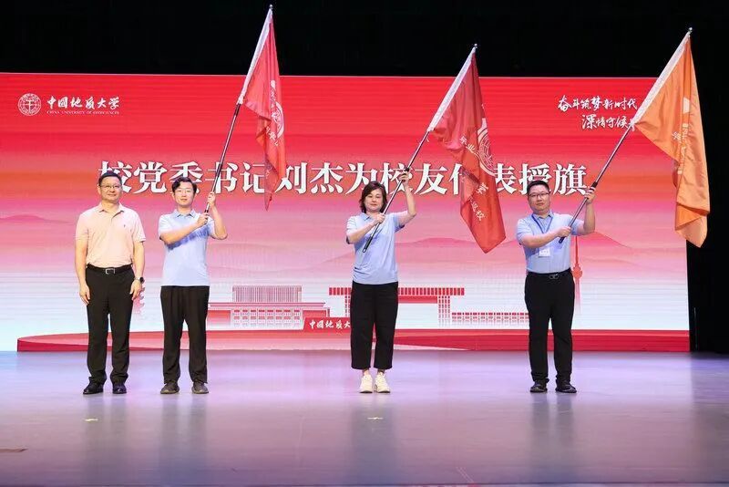 校党委书记刘杰为1995届校友代表、北京润康乐选商贸有限公司总经理刘京菁,2005届校友代表、中铁第四勘察设计院黄福海,2015届校友代表、湖北省建筑科学研究设计院部长助理廖昕授旗。