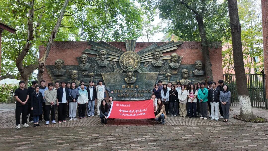 此次演出恰逢我国第一颗原子弹爆炸成功61周年,10月18日,剧组全体师生走进位于四川省绵阳市梓潼县的“两弹城”爱国主义教育基地,完成了一次从地质学家爱国情怀到“两弹一星”精神的深度对话。全体人员在邓稼先铜像前肃立致敬,献上鲜花表达对先辈的深切缅怀与崇高敬意。场馆中陈列的铀矿模型与话剧中勘探铀矿的剧情遥相呼应,让师生在历史与艺术的交融中,进一步体悟了李四光等新中国第一代科学家“爱国、求是、担当、奉献”的价值追求。