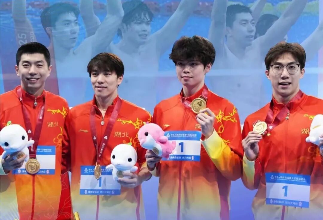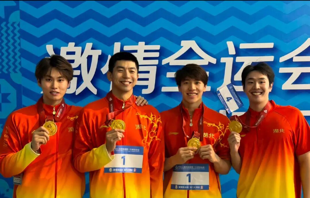 11月17日,在男子4×100米混合泳接力决赛中,体育学院2023级研究生孙佳俊、校友闫子贝与队友王梓成、徐海博紧密配合,以3分34秒39的成绩为湖北队夺得该项目历史上首枚全运会金牌。