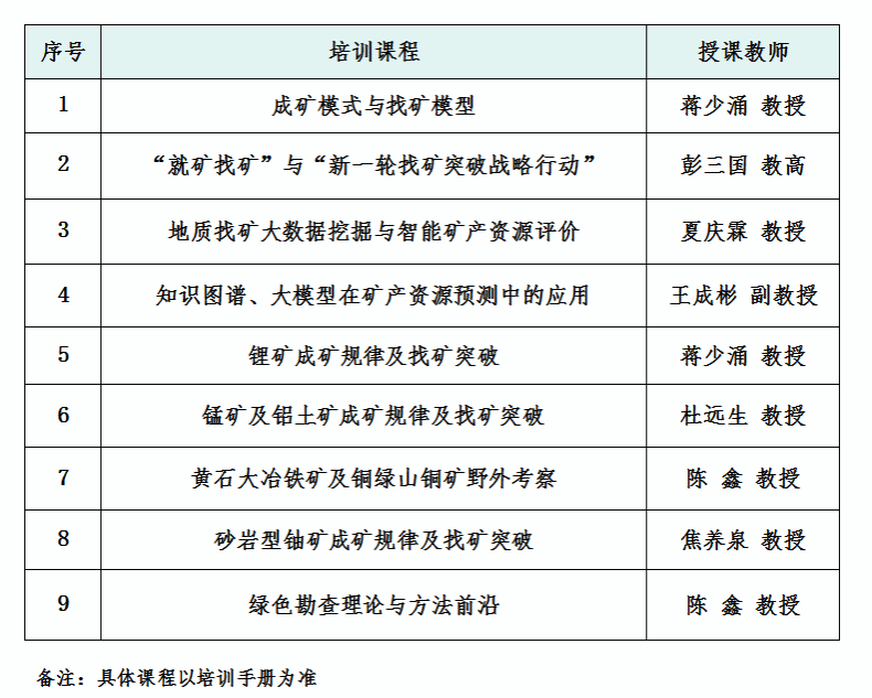 党的十八大以来,党中央始终将国家能源和矿产资源安全保障置于战略高度,多次作出重要指示批示,明确要求提升能源资源安全保障能力,坚定不移持续深入推进新一轮找矿突破战略行动,大力强化资源节约集约循环高效利用。习近平总书记着重指出:“要加大勘查力度,加强科技攻关,在新一轮找矿突破战略行动中展现更大作为、发挥更大作用。”2025年全国自然资源工作会议进一步明确,要立足国家长远发展需求,优化找矿突破战略布局,强化科技创新驱动,推动找矿工作向更高质量、更有效率、更可持续的方向迈进。根据找矿突破工作专业技术人才的知识更新需求,结合最新政策导向与行业发展趋势,中国地质大学(武汉)拟举办新一轮找矿突破工作专业技术人才知识更新工程高级研修班(第三期),现将有关事项通知如下。