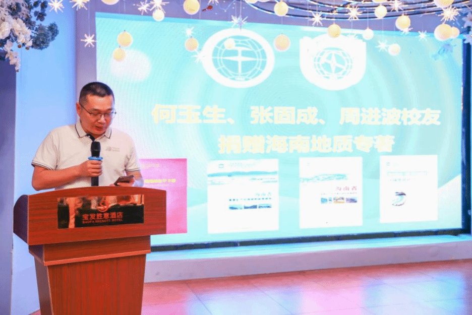 常务理事张固成在赠书仪式上讲话。赠送《海南岛土壤地球化学手册》《海南省重要矿产资源自然重砂资料应用研究》《海南省重要矿产资源化探资料应用研究》《海南临高-海口地区新生代盆地基础地质研究》一套四本,共5套20本,由海南省地质调查院何玉生、张固成、周进波3位正高级工程师校友主撰。