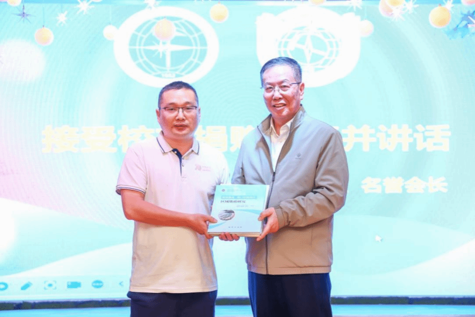 执行会长吴光帅宣读地大(武汉)、地大(北京)关于同意我会承办2026年“第七届地质资源环境高峰论坛暨第十四届中国地质大学全球校友会会长秘书长联席会”的决定并展示校旗