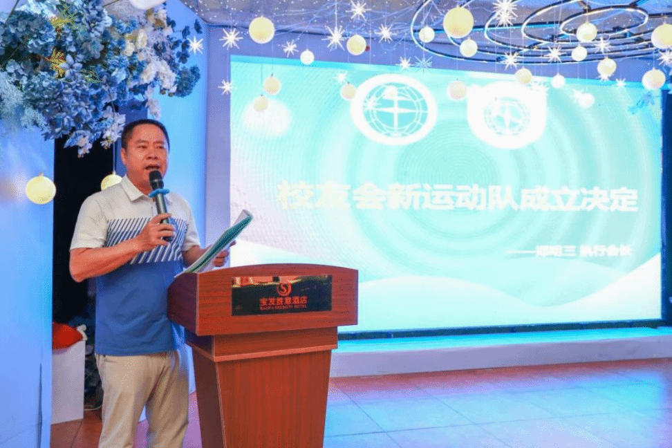 执行会长郑明三宣读关于授予任传真为校友会篮球队筹建负责人、李沛泽为校友会户外运动队筹建负责人、丁越为校友会高尔夫球队负责人、朱佳睿为校友会武术队筹建负责人的决定