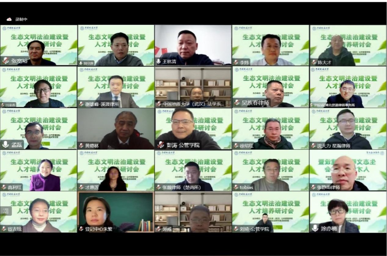 本次会议邀请了来自自然资源部、湖北省自然资源厅、湖北省环境资源法学会、武汉大学、中国政法大学、华东政法大学、中南财经政法大学、中国地质大学(北京)、知名律师事务所等高校及单位的20余位自然资源领域的专家学者,他们围绕生态文明法治建设人才培养主题,就如何发挥高校和重点实验室平台优势,培养高质量生态文明法治人才队伍等问题展开探讨。200余人次线上参加会议。